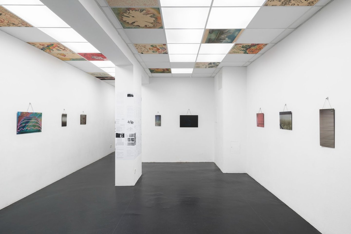 Making a link between its complicated history and the present state of this partly decrepit building, Holtz’ swapping of the ceiling panels between Café Kotti and Stations, seeks to make visible the shifting communities that continue to coexist within this space. Holtz works with artefacts from the building and its history: the installation Macht das Tor auf creates a bridge between different localities within the building – here, the neighbouring Café Kotti and Station’s exhibition space. Café Kotti’s panels, individually painted by guests of the Café and residents of the building, marked by nicotin stains, water damage, and years of wear, bear traces of time specific to the usage at the café. The swapping between Stations and Café Kotti generates both a concrete and symbolic permeability: two spaces begin to overlap, and architecture itself becomes a medium of transference. In the café, the white panels taken from the ceiling of the exhibi- tion space that Holtz inserted as placeholders appear as an inscription “in the other direc- tion”: they mark not only an exchange but also an echo – a trace suggesting that something else is “breathing” here. At Stations, the in- stallation continues along the columns – the piece Ein Zentrum ist das nicht is based on a report about life in the NKZ from the perspective of its residents, it unfolds as a double movement: a retranslation of architecture into lived experience, and a transference of those experiences into artistic form.